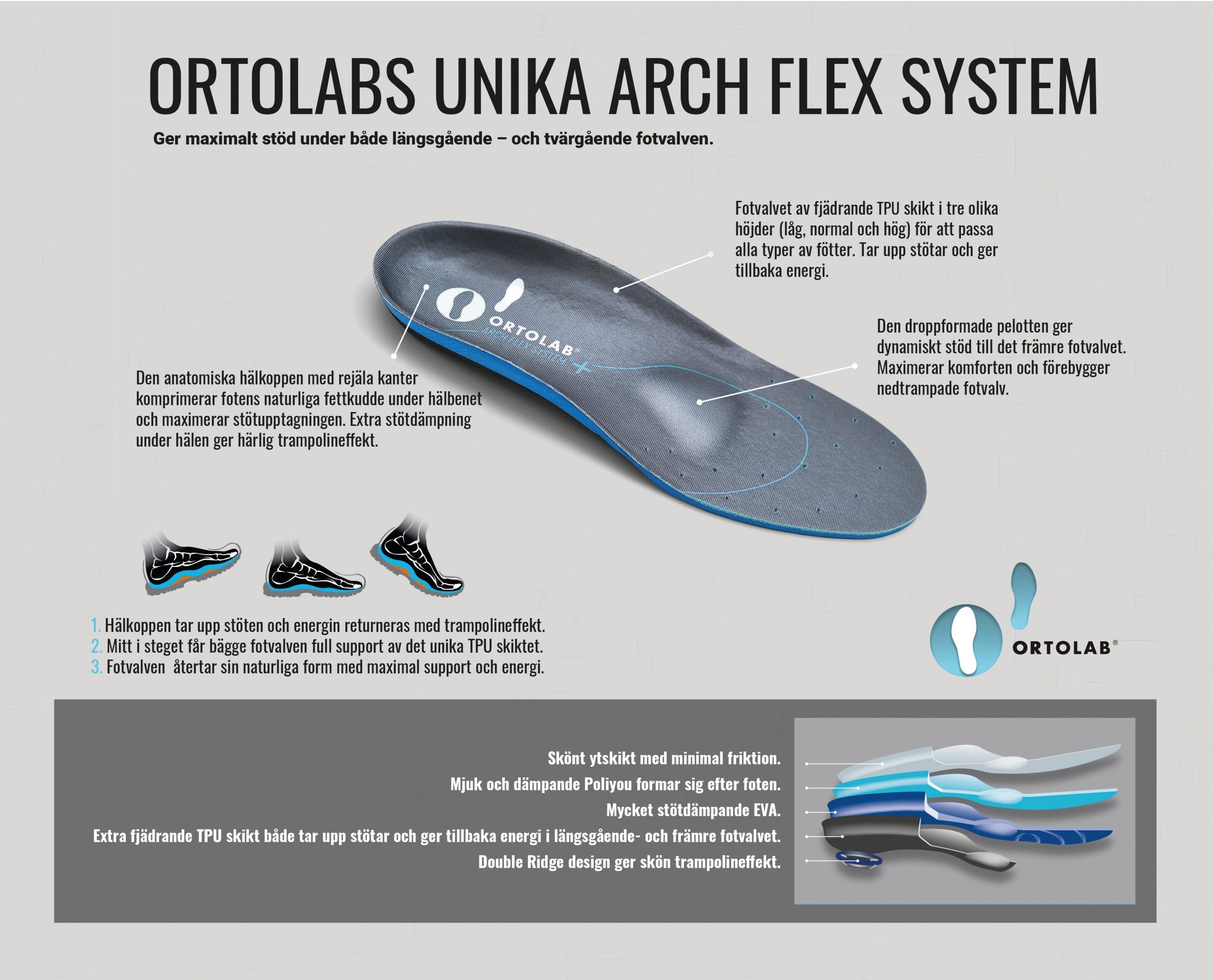 Ortolab AFS finns med tre olika fotvalvshöjder: HÖG, NORMAL och LÅG. Den har en pelott ”framfotskudde” som stöd för det främre fotvalvet. Ortolab Arch Flex System bygger på vårt tidigare världspatent.